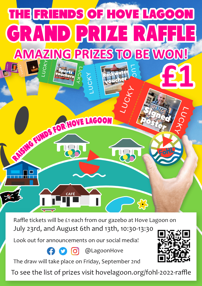 Our 2022 Grand Raffle launches on Saturday. Please see the attached leaflet. If you would like to buy some tickets (£1 each,) visit us at our gazebo at the Lagoon on Saturdays 23rd & 30th July and 6th & 13th August – weather permitting. We are happy to deliver tickets locally (via Lagooneroo). If you would like to sell some raffle tickets for us, please let me know. The list of the wonderful prizes and their donors will be at our gazebo and on our website and Facebook pages. More info in the next Hovarian. The proceeds will be going towards Lagoon improvements. If you have any useful ideas to make Hove Lagoon even more wonderful, let me know.