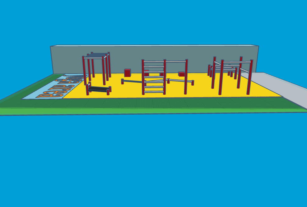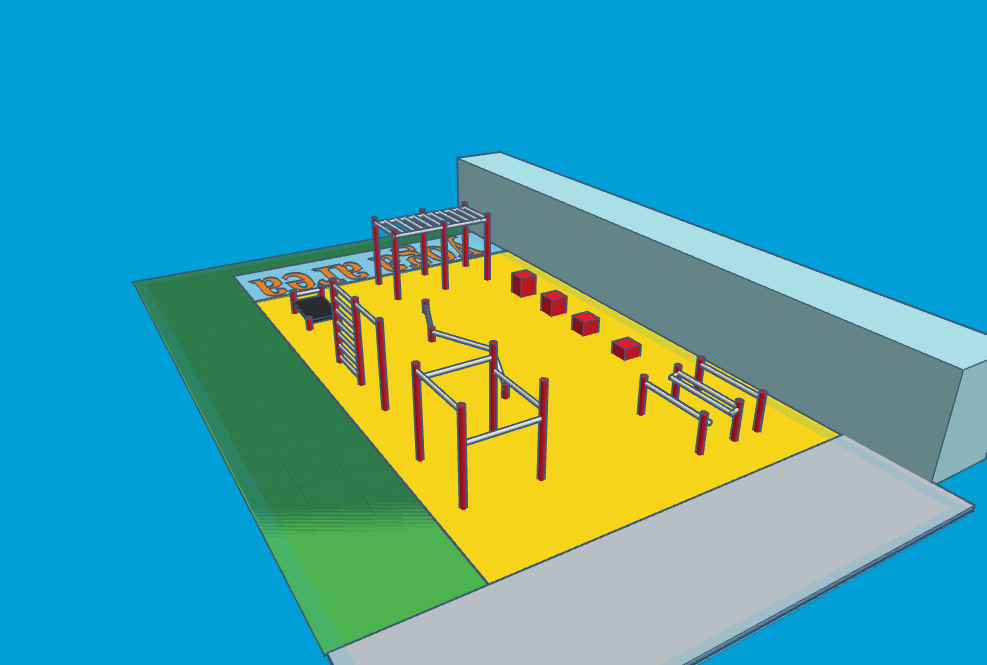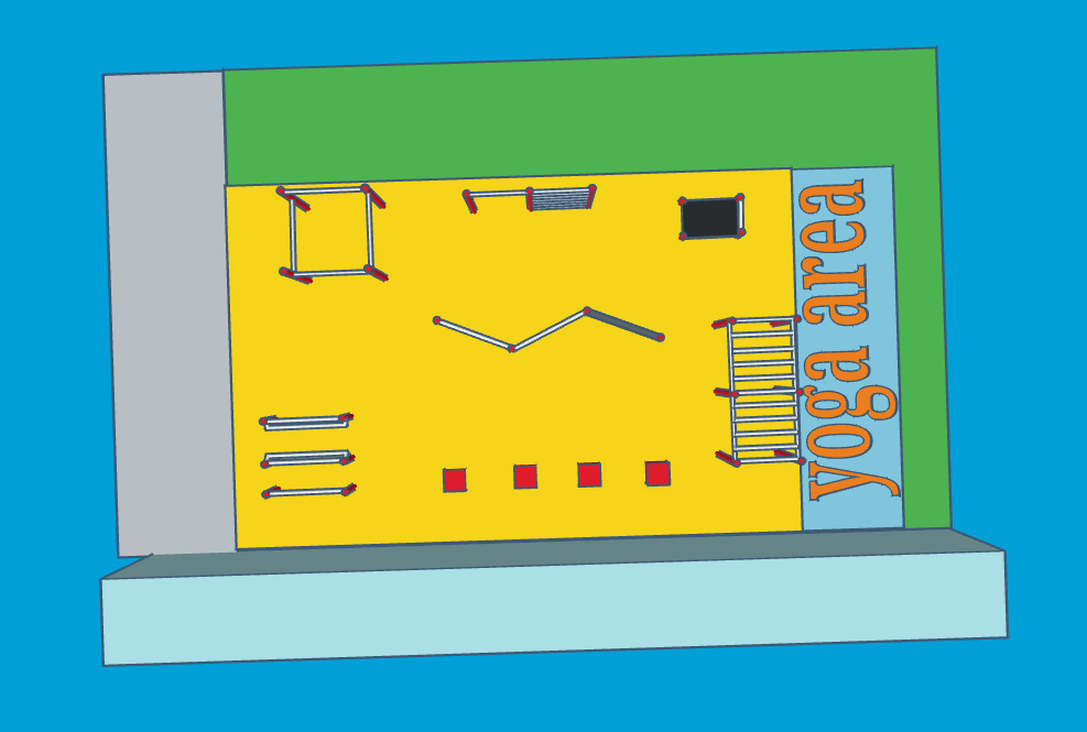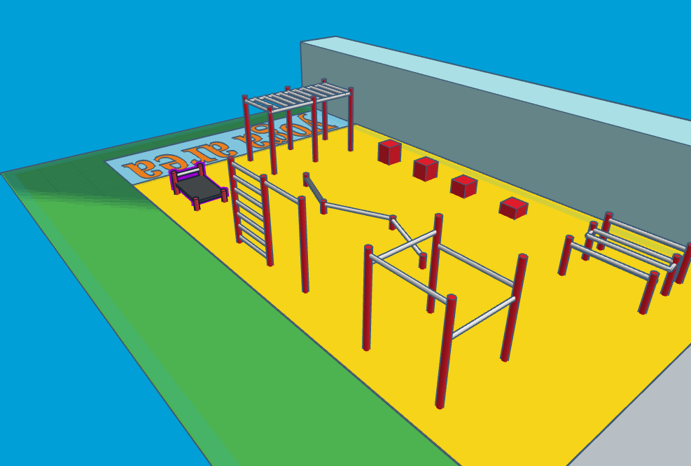 Here is an artist’s impression of the proposed design. Please note this model is NOT TO SCALE and the finished gym will almost certainly have different colours and equipment designs, depending upon the eventual choice of supplier.
